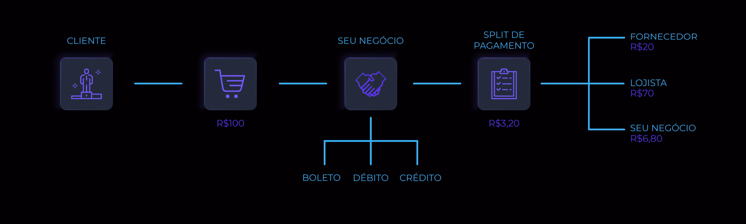 O Split de Pagamento permite dividir o valor de uma transação entre diferentes beneficiários, de forma automatizada, ideal para plataformas que envolvem múltiplos parceiros ou comissões.
